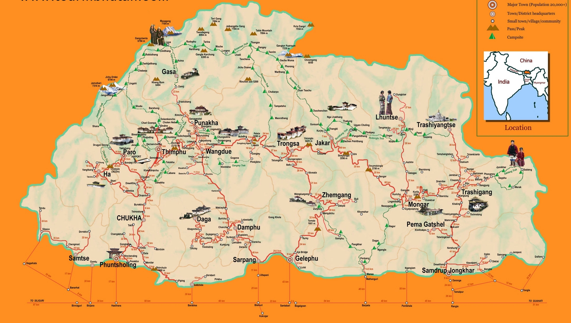 - Ins Ura Tal: Die Fahrt nach Ura ist landschaftlich sehr schön und bei klarem Wetter kann man den höchsten Berg Bhutans, den Gankar Puensum, sehen. Das kleine Dorf Ura liegt auf 3.100 m Höhe und wird von einem großen Kloster überragt. Die Bewohner leben von Weidewirtschaft und Kartoffelanbau.